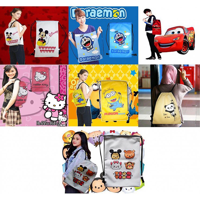 Tas Serut Karakter Bag Kartun Lucu Unik Motif Hello Kitty Doraemon Mickey Mouse Minion Panda Tsum Ts Shopee Indonesia